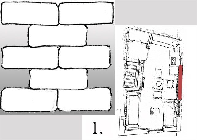 Durchgebrochenes Mauerwerk erneuern. Wiederherstellung des alten ausgemauerten Fachwerks, Wiederverwendung brauchbarer Steine.