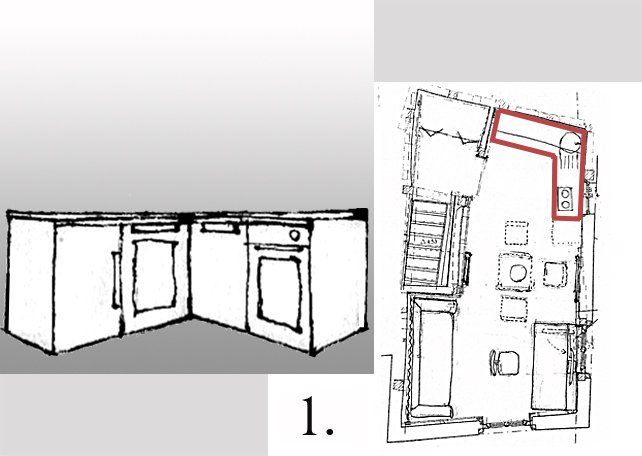 Küchenzeile mit viel Arbeitsfläche, Platz für Kühlschrank, Müll, Eckspülbecken, Spülmaschine, Backofen und Kochplatte.